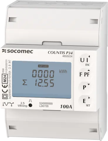 | Beschrijving | Modulaire actieve-energiemeters COUNTIS P34 MID-gecertificeerd Driefasig - direct 100A, MODBUS type elektrische protocollen, volledig geïntegreerd in SOCOMEC ecosysteem inclusief: Webview/schermen/gateways/configuratiesoftware |